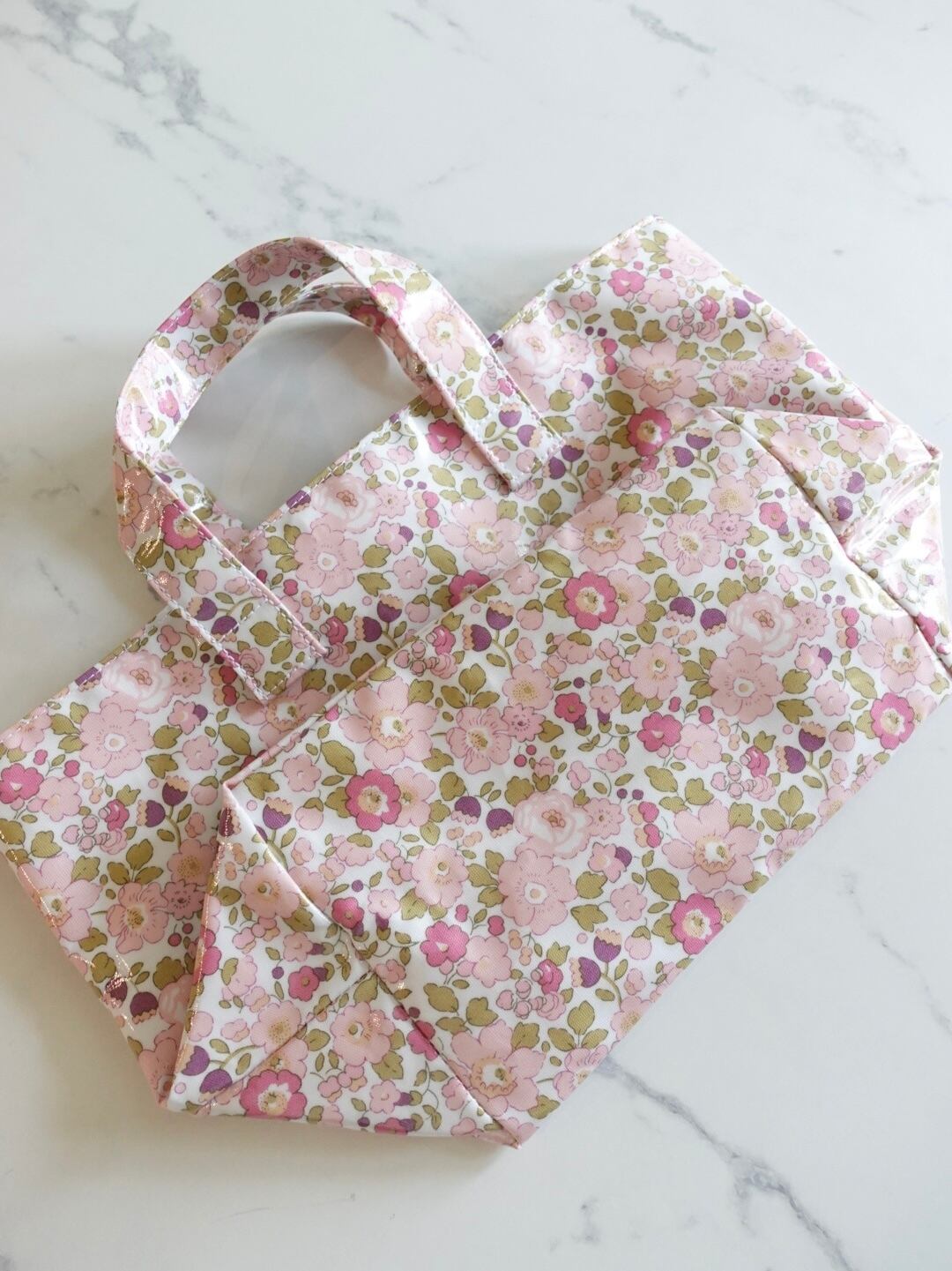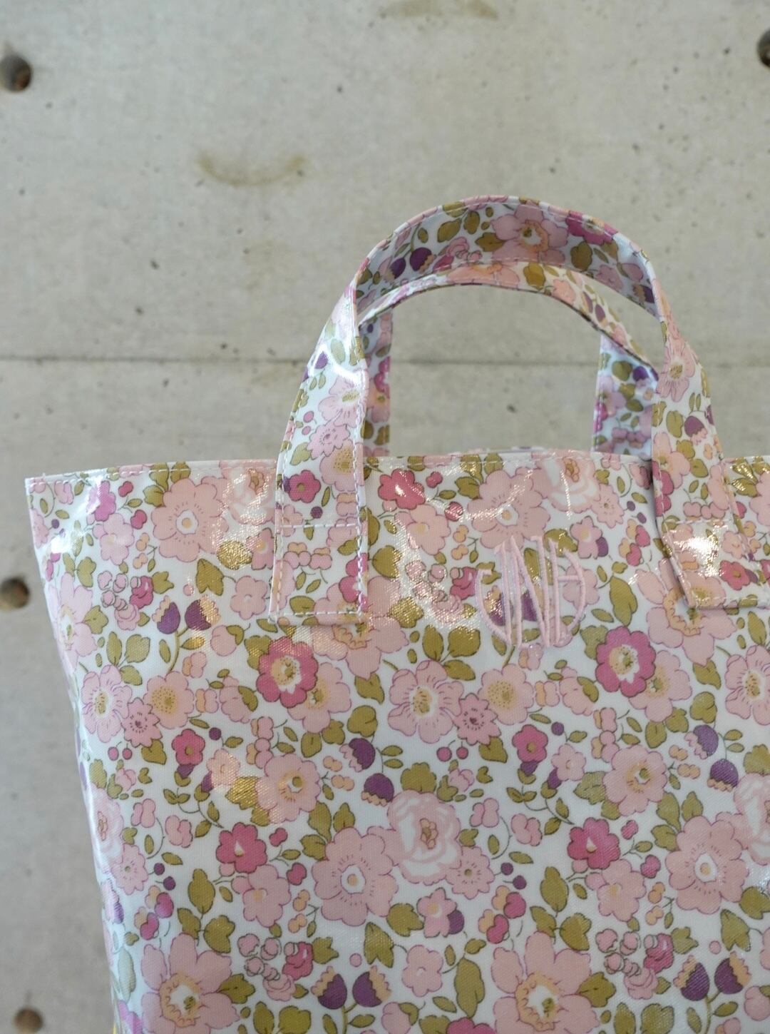 淡いお色味の花柄にPVC加工を施し、撥水加工のある裏地をつけております