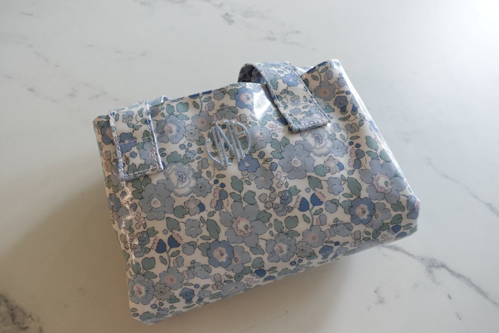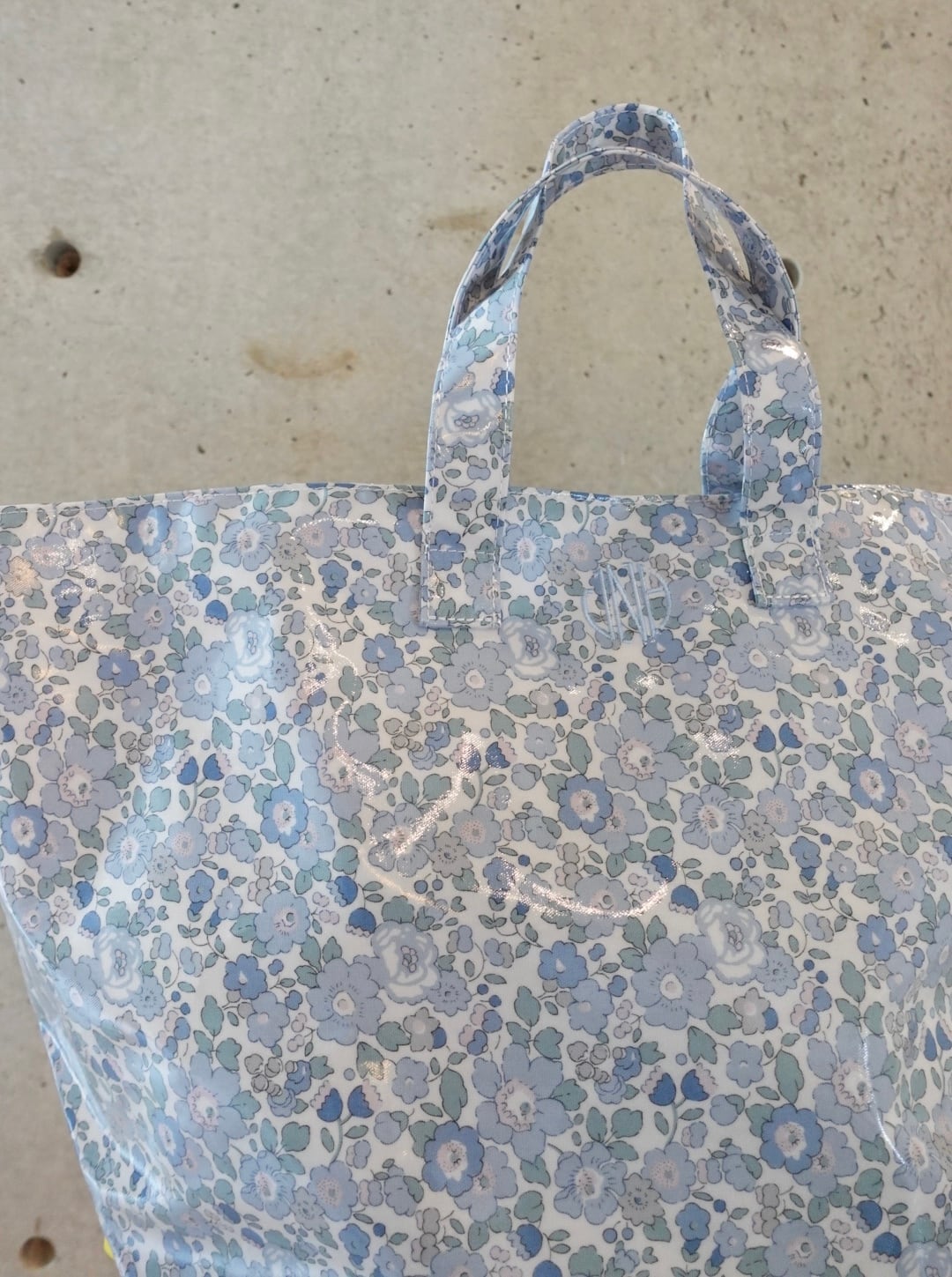 淡いお色味の花柄にPVC加工を施し、撥水加工のある裏地をつけております