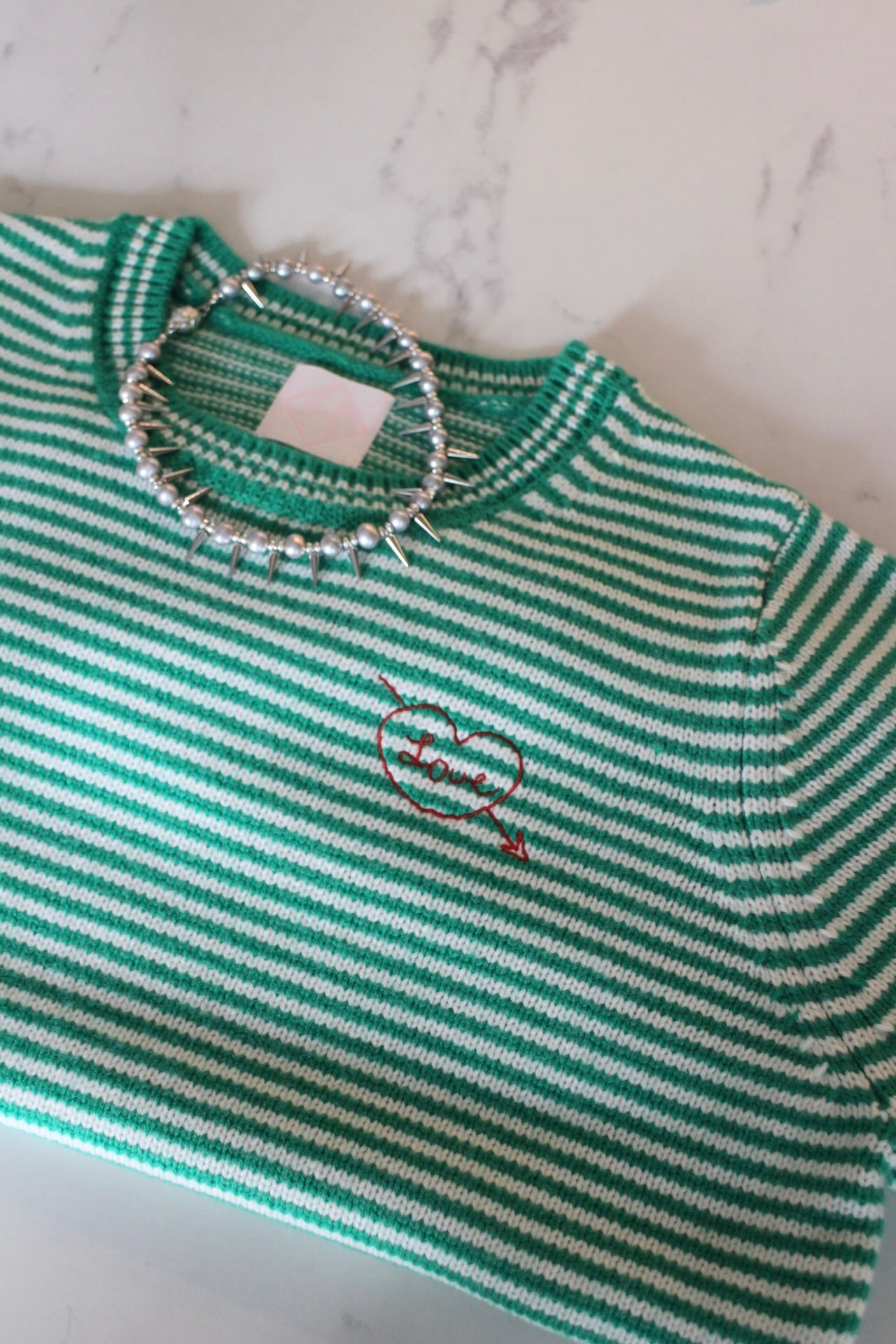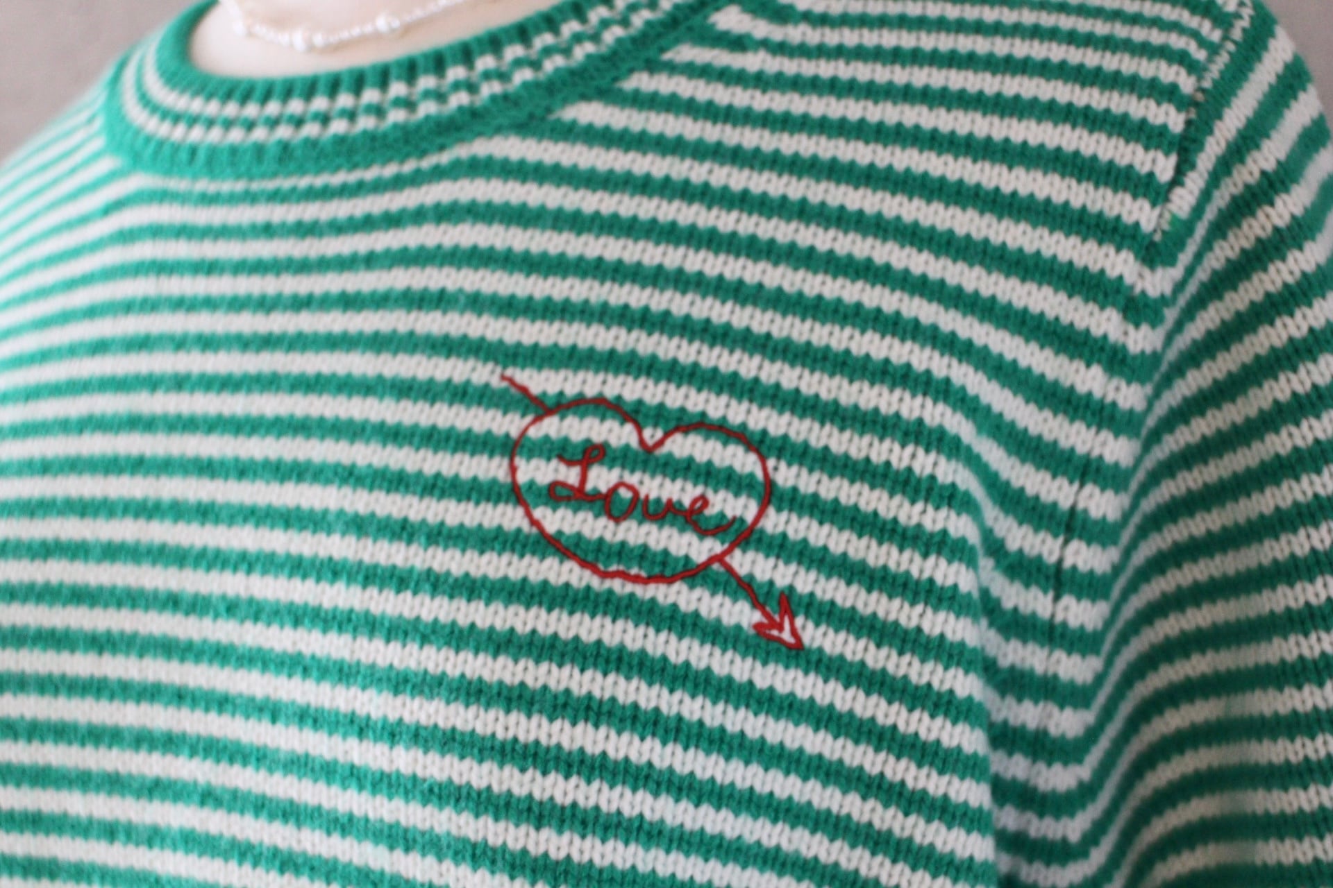 ポイントの手書きのハートに矢が刺さった刺繍は