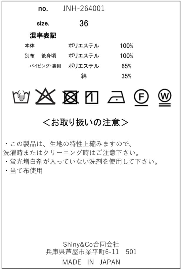 ・本体:ポリエステル100%、(別布(後身頃):ポリエステル100%)、(パイピング(裏側)ポリエステル65%、コットン35%)